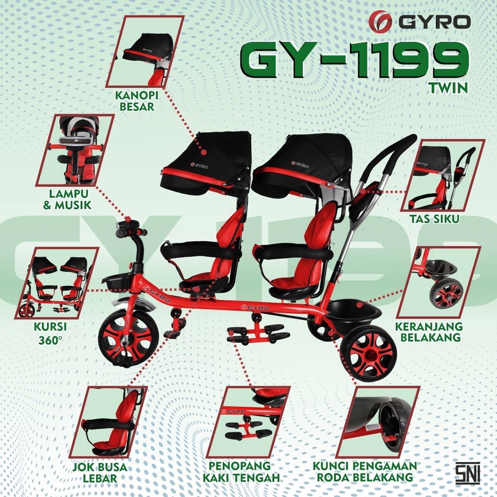 Sepeda Anak bayi balita Roda Tiga Stroler twins Anak Twin GYRO GY1199 Kembar Dua Kursi SNI Garansi Termurah