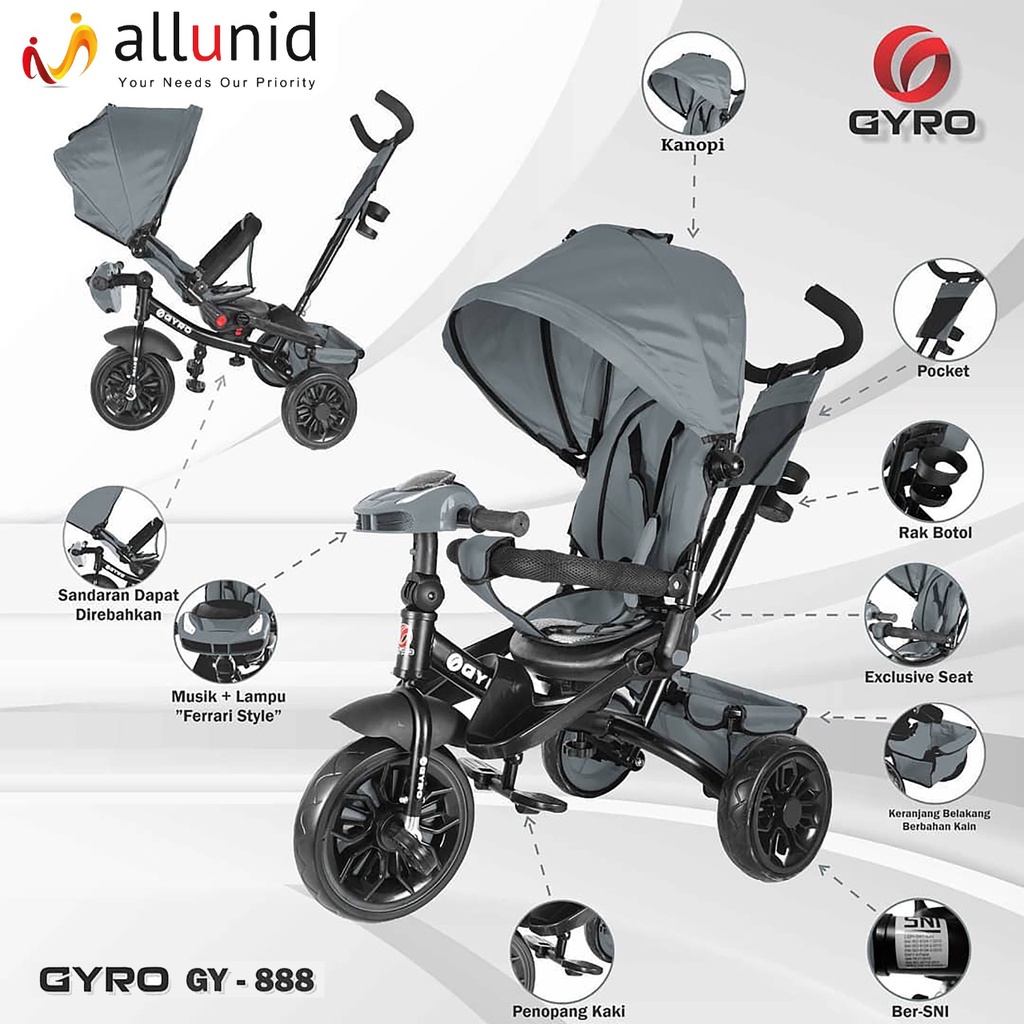 Sepeda Roda Tiga Anak Stroler GYRO ST GY 888 Tricycle Bike Lipat + Putar dan Kanopi SNI Garansi Termurah