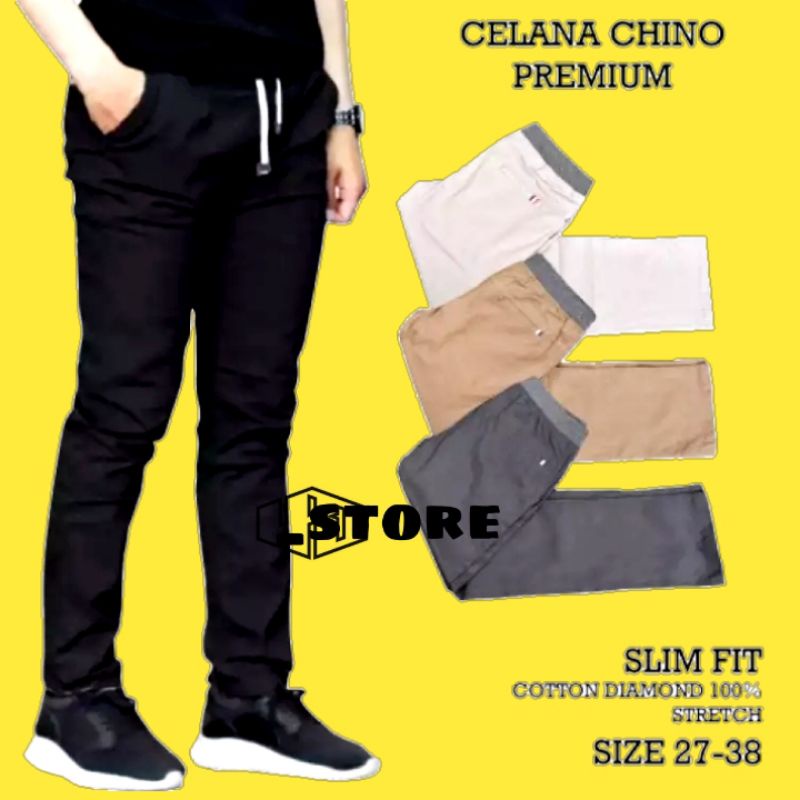 Celana Pria SLIMFIT Panjang Chino KERJA HARIAN HITAM MOCCA ABU CREAM SIZE 27-32 KARET PINGGANG celana panjang katun Chino pria panjang distro celana pria karet pinggang model terbaru premium celana panjang pria kasual